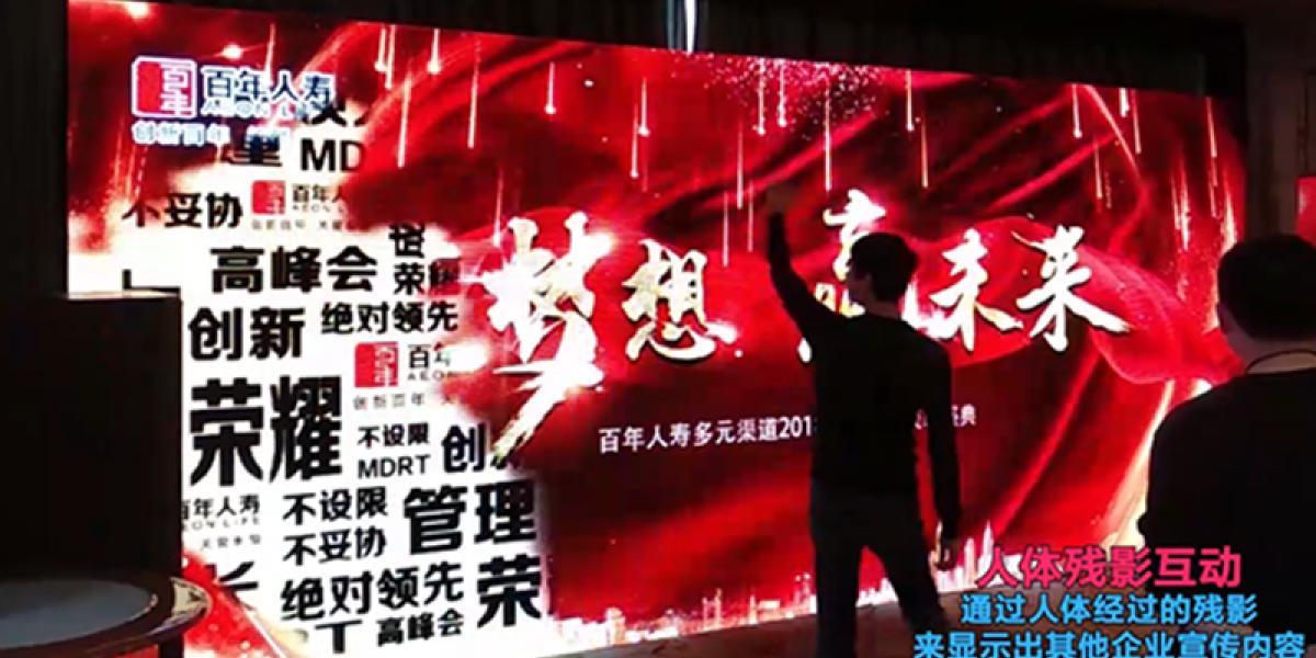 人体残影互动,当人经过投影墙时,人体的影像将会把图像涂抹掉显示出下面的影像效果,进来突出显示企业宣传内容。